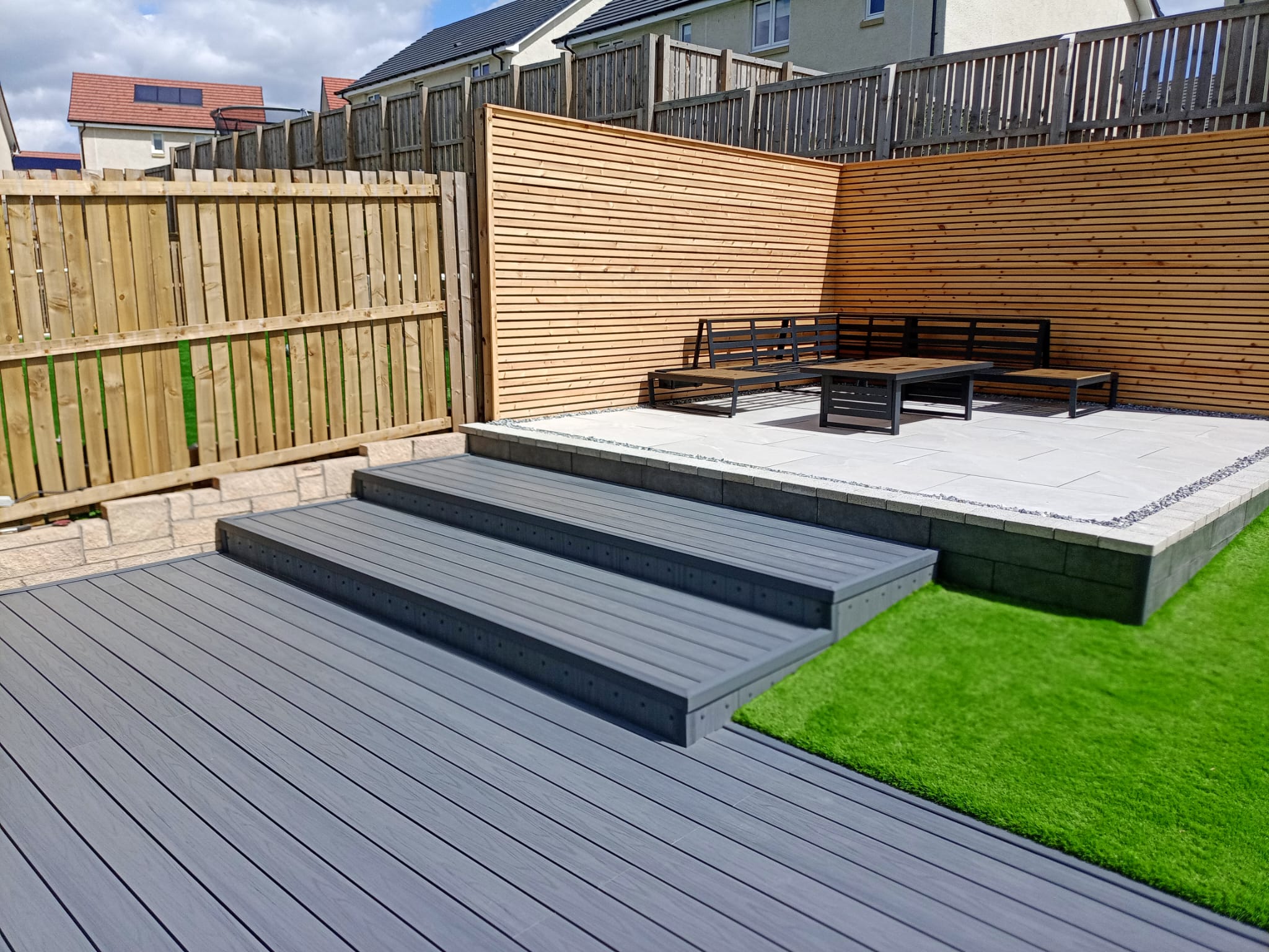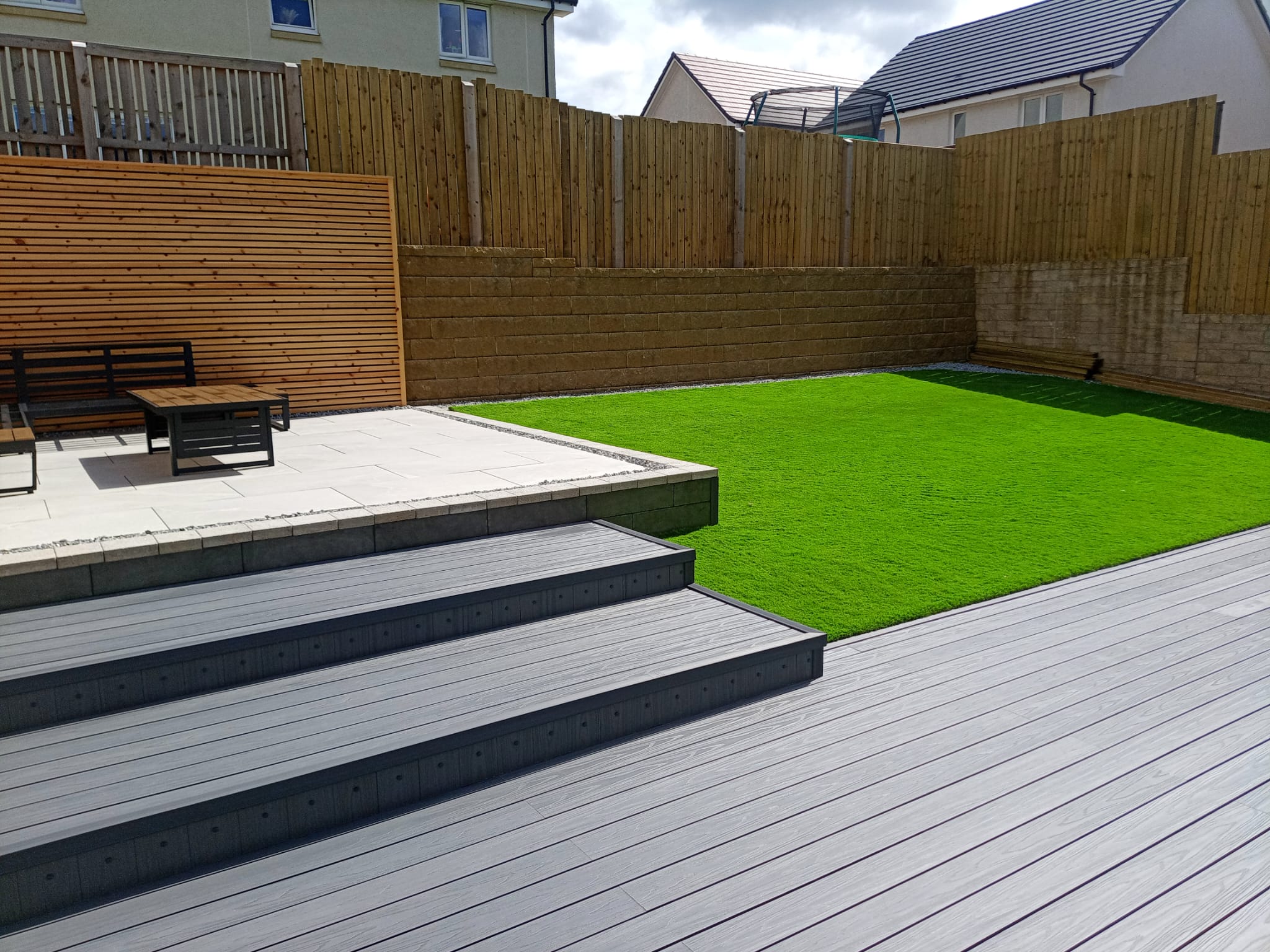 A great composite deck leading to a porcelain patio with a feature fence for privacy, with very lush artificial grass.