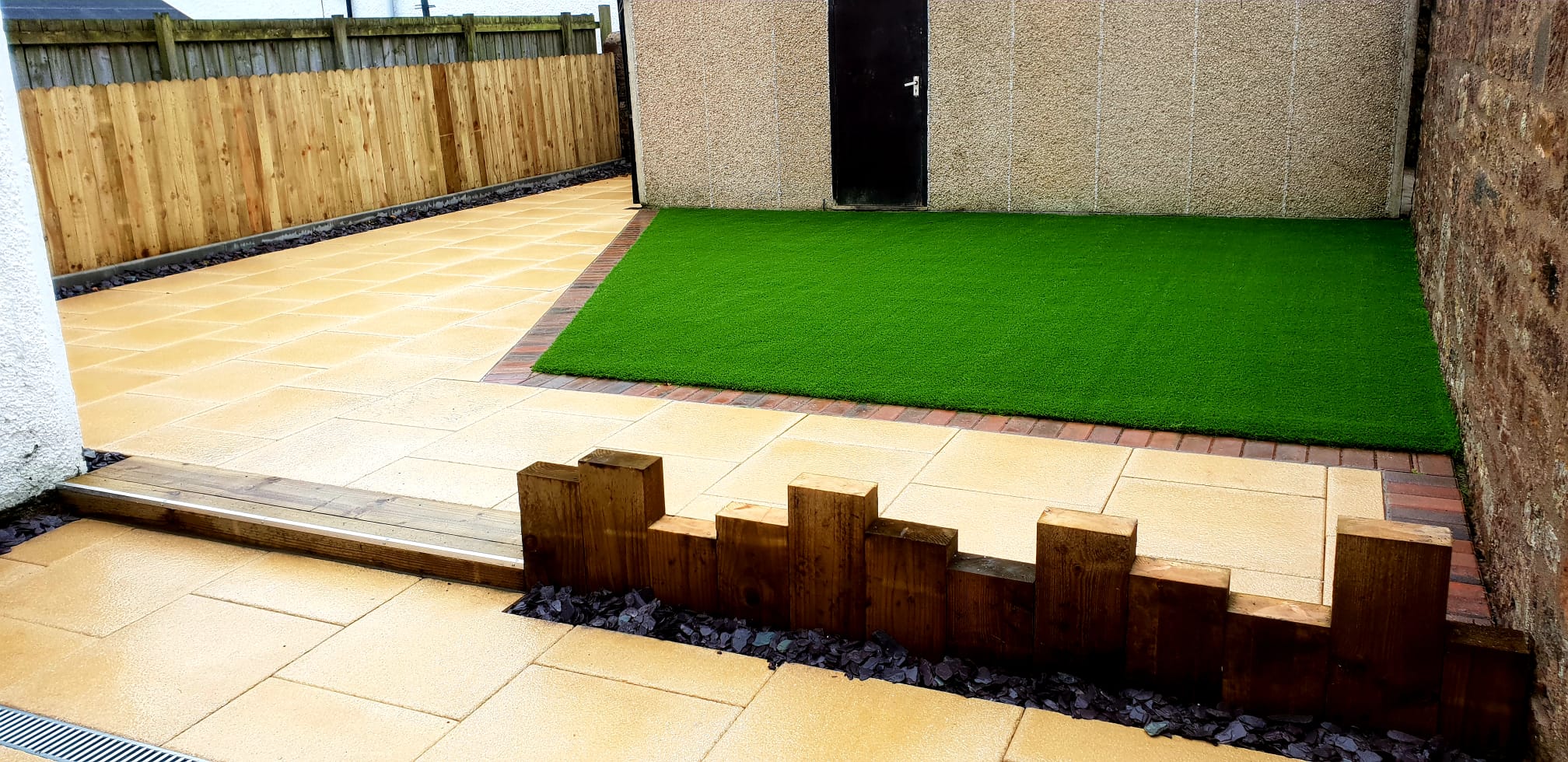 Nice concrete slabbed patio with mono edge, artificial grass and a railway sleeper retaining wall.