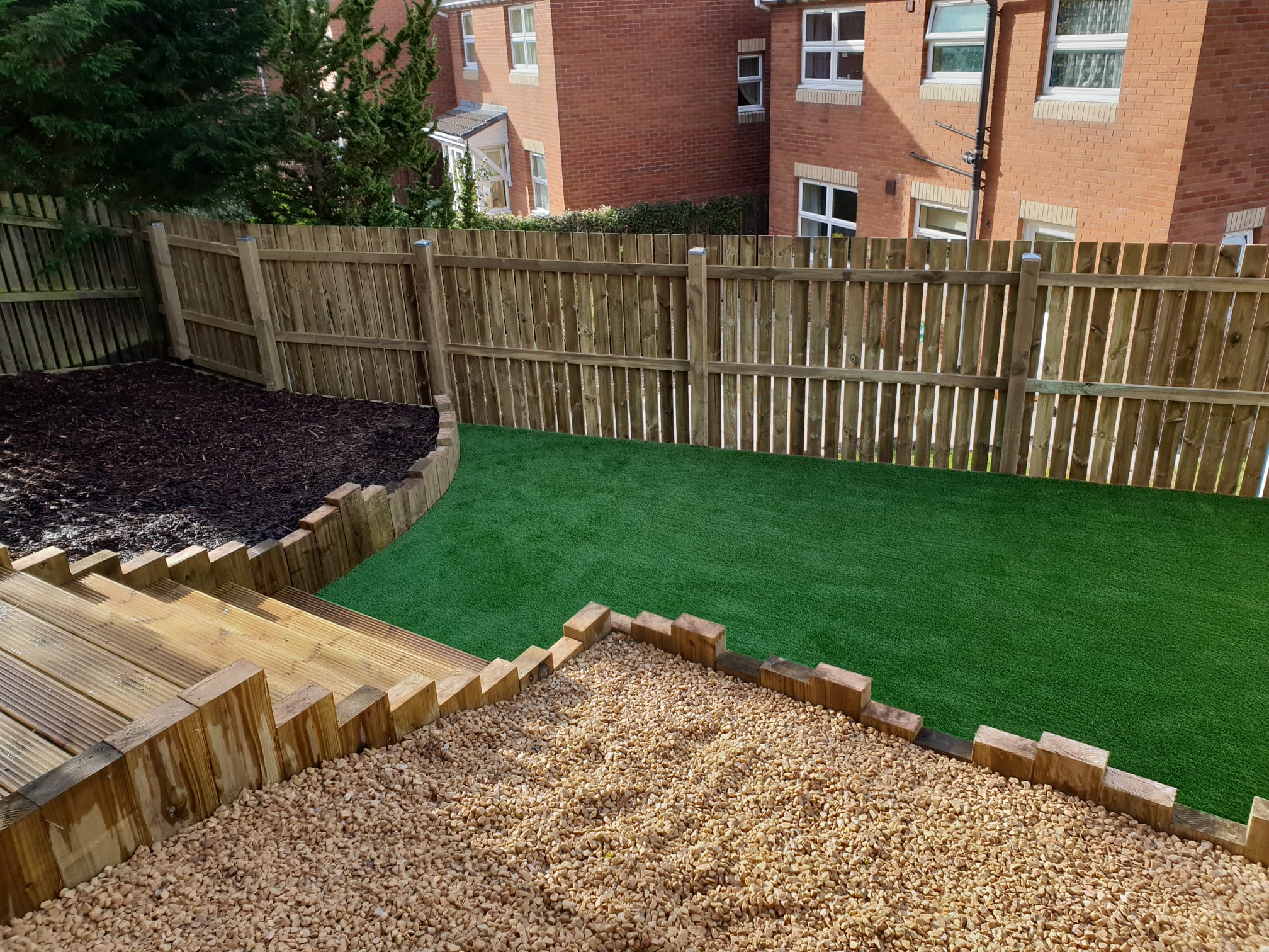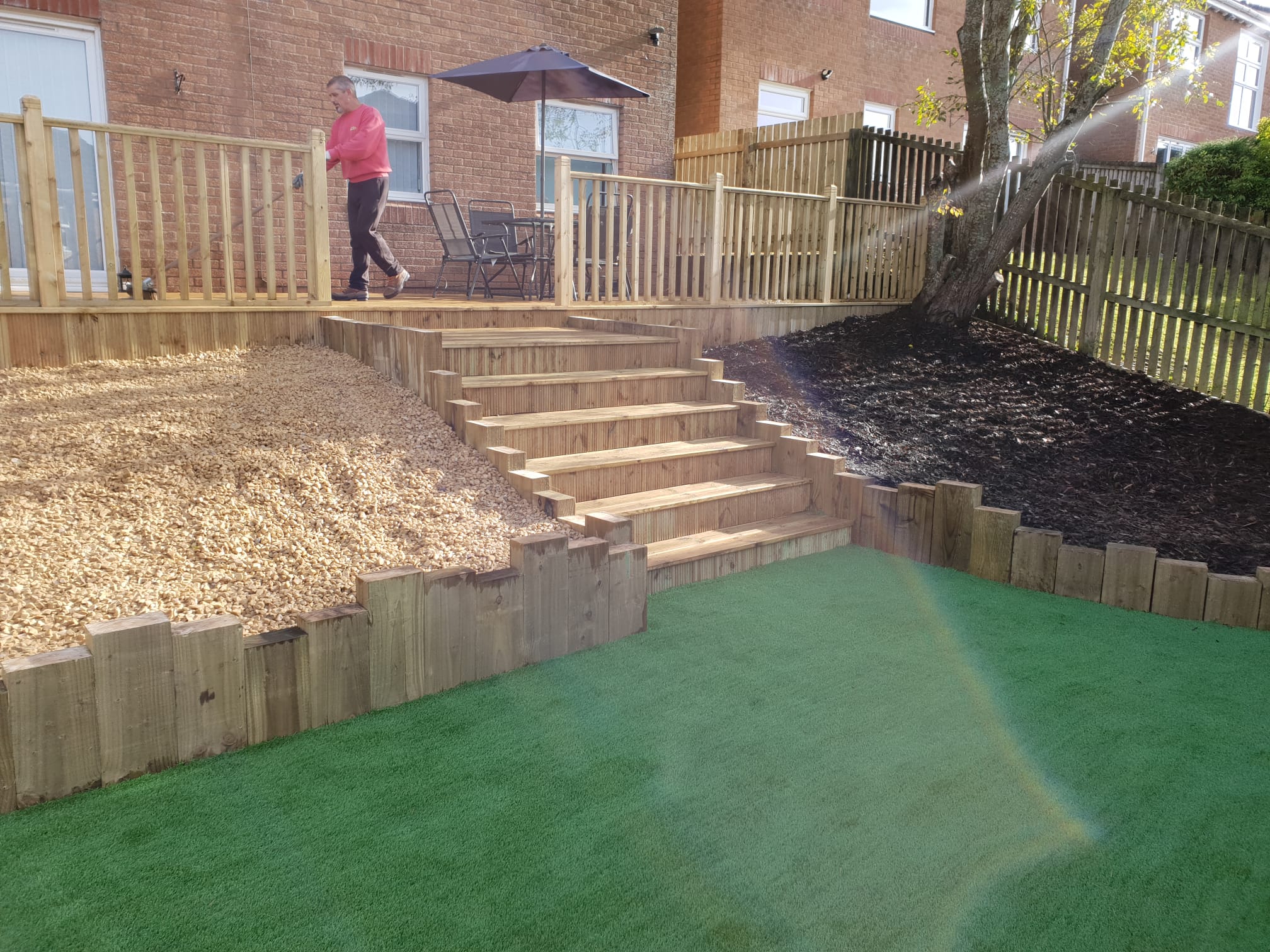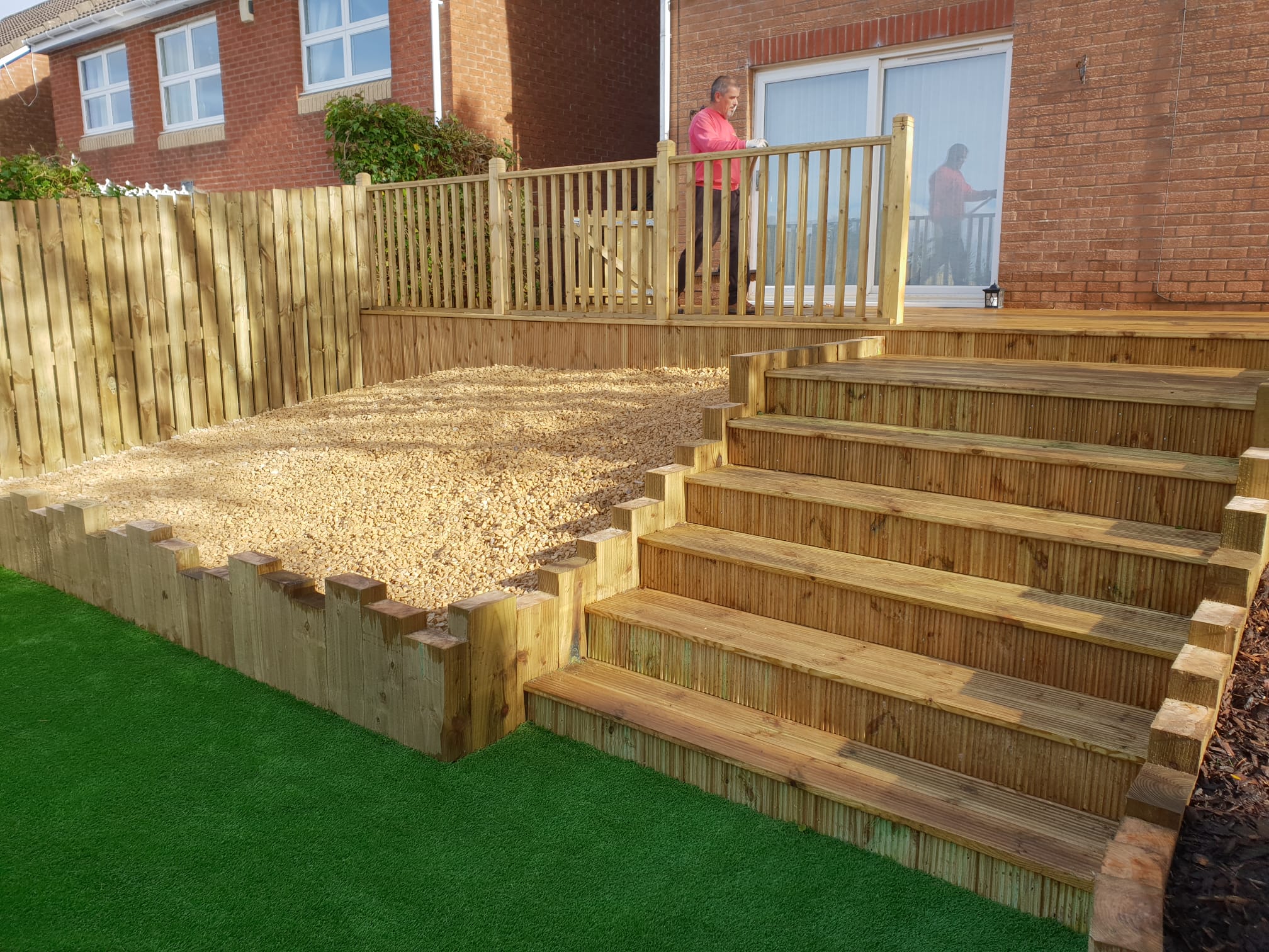 Steep hill from patio doors, we fitted full length timber deck installed new steps fitted artificial grass and made garden more accessible and child friendly.
