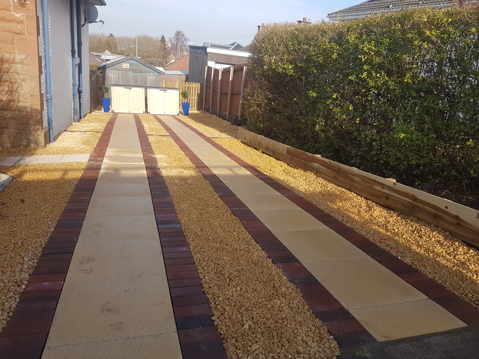A very long driveway, all slabs and mono block bedded on a bed of concrete and all sides hunched in concrete on compacted 150mm hardcore with full weed fabric and decorative stone.